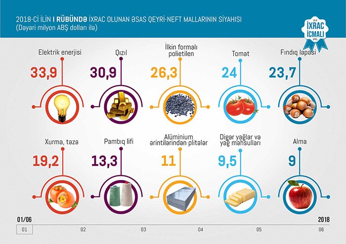 Dövlət Statistika Komitəsinin məlumatına əsasən 2018-ci ilin I rübü ərzində ixrac olunan qeyri-neft sektoru məhsulları arasında elektrik enerjisi (33,9 milyon ABŞ dolları) birinci, qızıl (30,9 milyon ABŞ dolları) ikinci, xüsusi kütləsi 0,94-dən az olan ilkin formalı polietilen (26,3 milyon ABŞ dolları) üçüncü olub.