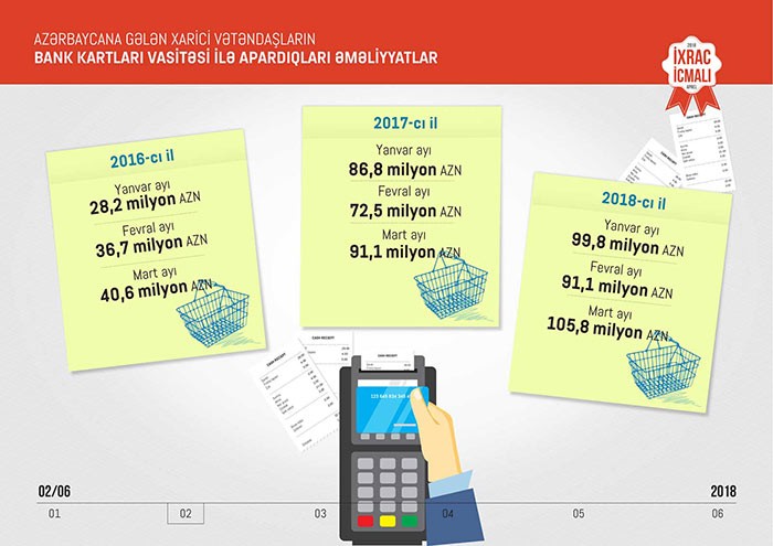 "Marja"nın məlumatına görə,“İxrac İcmalı”nda məlumat verilib ki, 2018-ci ilin I rübündə Azərbaycana dünyanın 151 ölkəsindən 629,4 min və ya ötən ilin müvafiq dövrü ilə müqayisədə 12,4 faiz çox əcnəbi və vətəndaşlığı olmayan şəxs gəlib. 2018-ci ilin mart ayları ərzində Azərbaycana gələn xarici vətəndaşların bank kartları vasitəsi ilə apardıqları əməliyyatların 105,8 milyon manat təşkil edib və ötən ilin mart ayı ilə müqayisədə 16 faiz artıb.