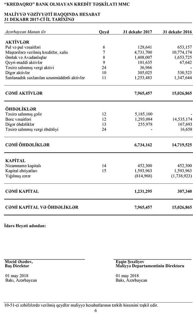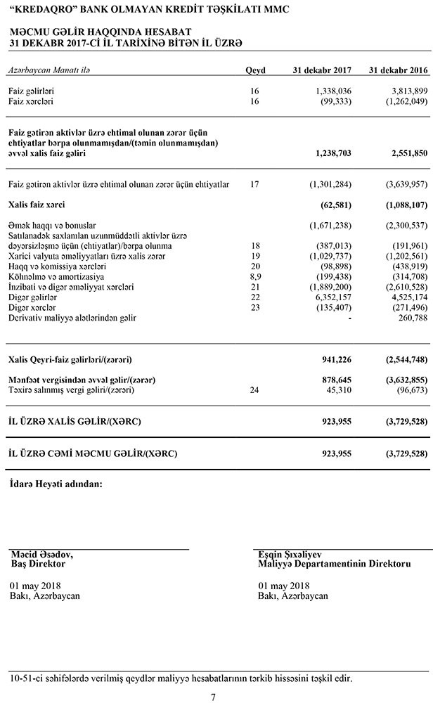 “Kred Aqro” Bank olmayan kredit təşkilatı 2017-ci ili 923 min 955 manat xalis mənfəət ilə başa vurub. Təşkilat 2016-cı ili 3 milyon 729 min manat zərər ilə bağlamışdı.