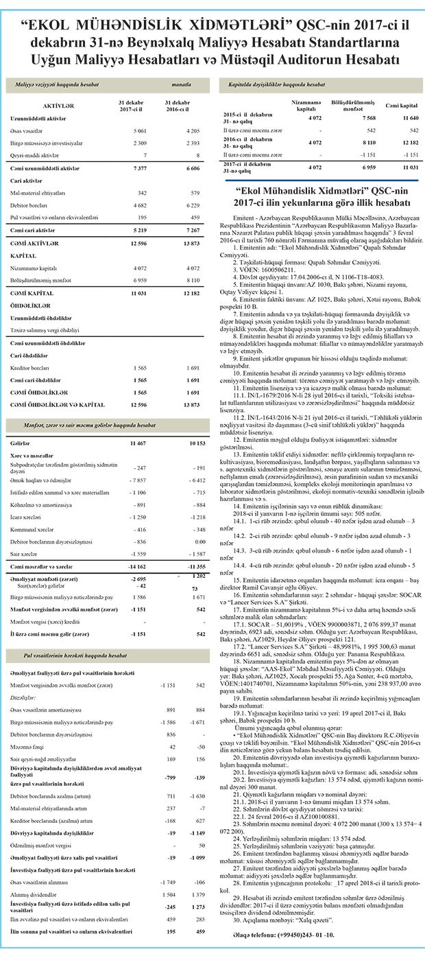 Ətraf mühitin mühafizəsi istiqamətində fəaliyyət göstərən "Ekol Mühəndislik Xidmətləri" QSC 2017-ci ili zərər ilə 1 milyon 151 min manat zərər ilə başa vurub. QSC 2016-cı ili 542 min manat xalis mənfəət ilə başa vurmuşdu.