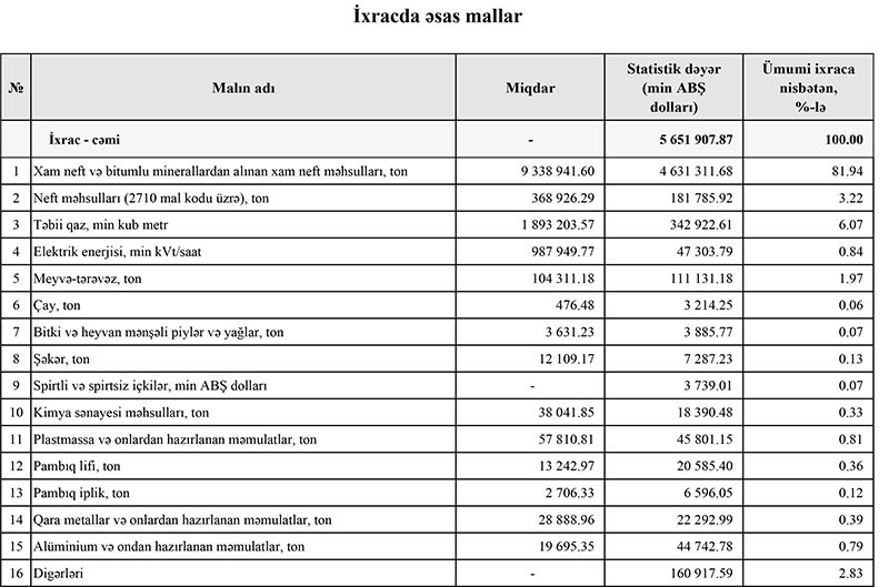 Hesabat dövründə xam neft və bitumlu minerallardan alınan xam neft məhsulları Azərbaycanın ümumi ixracının 81,94%-ni tutub.