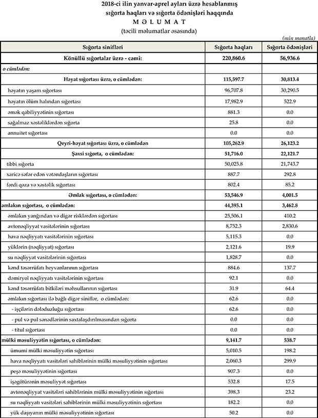 2017-ci ilinilk 4 ayı ərzində hesablanmış sığorta haqları 194 milyon 172 min manat təşkil etmiş, 75 milyon 319 min manat manat sığorta ödənişi həyata keçirilmişdi. Beləliklə, ötən ilin eyni dövrü ilə müqayisədə 2018-ci ilin yanvar-aprel ayları ərzində yığımlar 55%, ödənişlər isə 4% artıb.