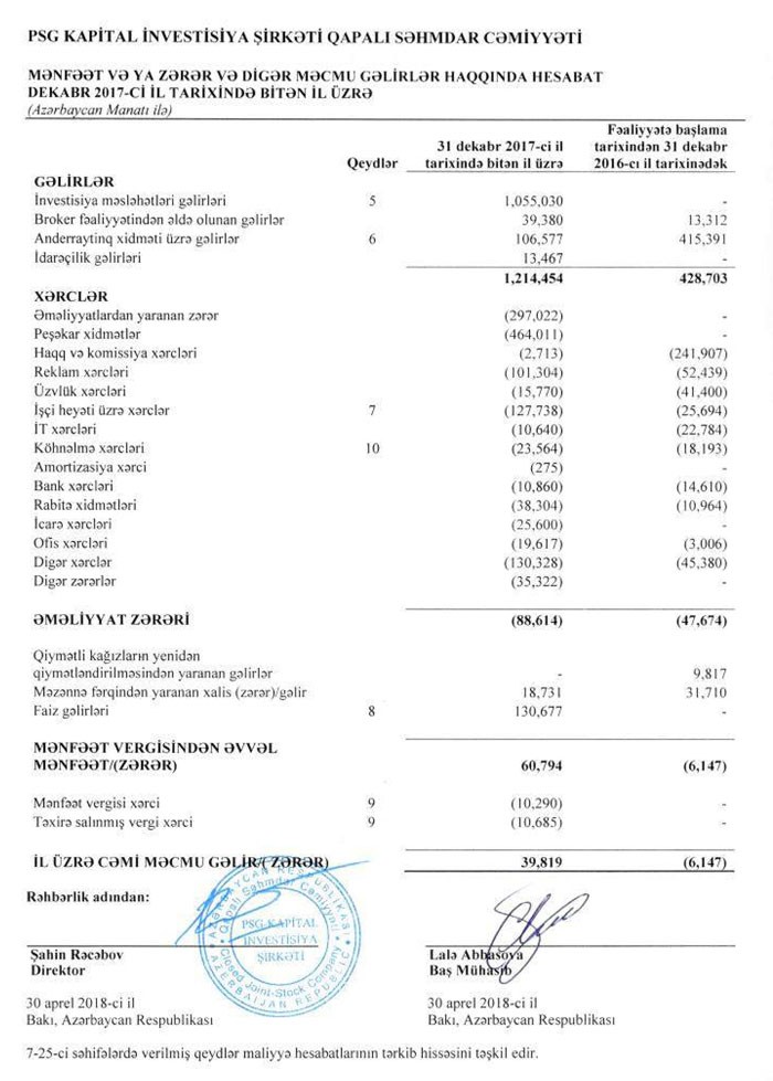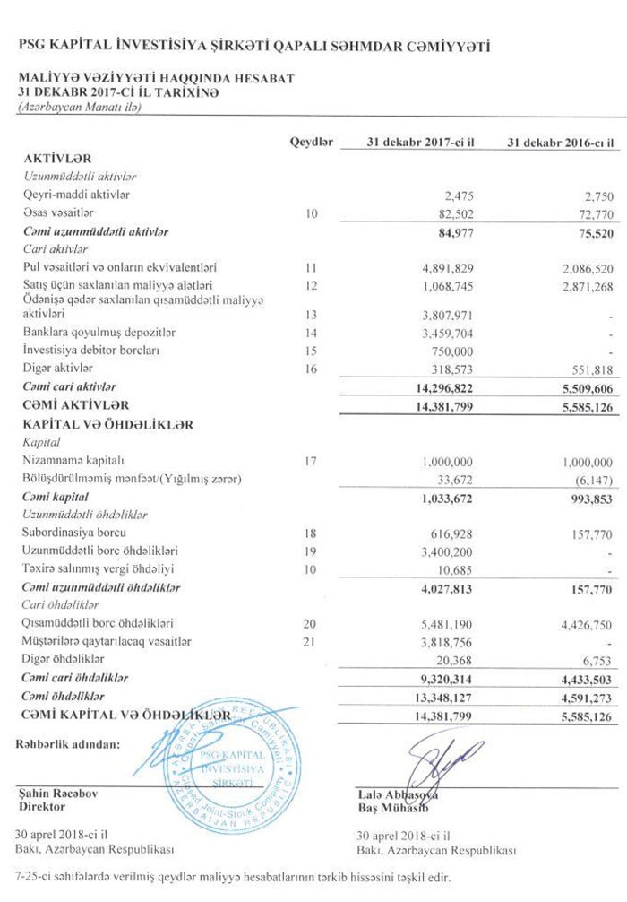 "PSG-Kapital İnvestisiya Şirkəti" QSC 2017-ci ili 39 min 819 manat xalis mənfəətlə başa vurub. Halbuki şirkət, 2016-cı ildə 6 min 147 manat zərər etmişdi.