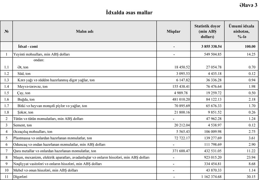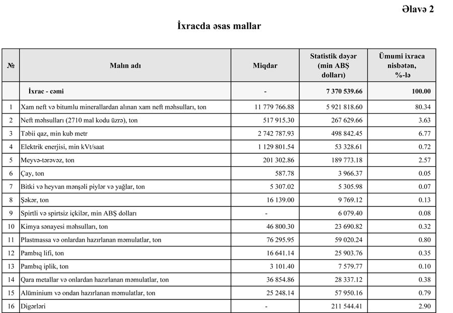 Mayda Azərbaycanın ixracı 1 milyard 718 milyon 89 min dollar, idxalı 829 milyon 213 min dollar, saldo isə müsbət 888 milyon 875 min dollar olub.