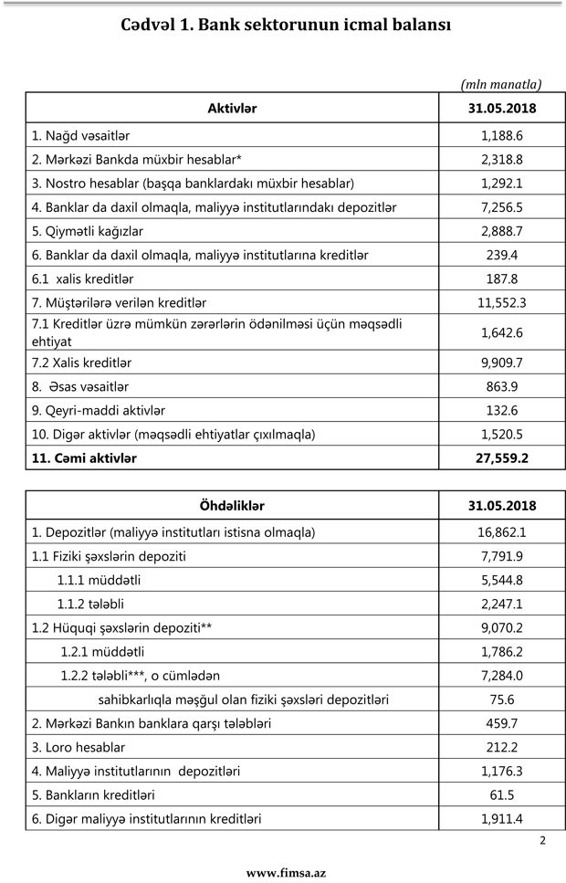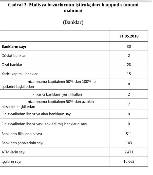 Sektorun balans kapitalı 3 milyard 929 milyon manat, əhalinin əmanətləri isə 7 milyard 868 milyon manat olub. 2018-ci ilin may ayı ərzində bank sektorunun aktivləri 0.3% (92 mln. manat), öhdəlikləri 0.6% (149 mln. manat) azalıb, kapitalı isə 1.5% (57 mln. manat) artıb. Bank sektorunda kredit aktivliyinin artması müşahidə olunur. Belə ki, kredit portfeli may ayı ərzində 1.1% (130 mln. manat) artıb.