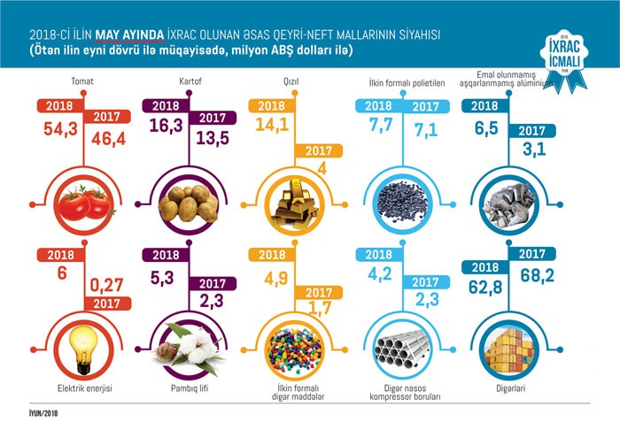 2018-ci ilin may ayında qeyri-neft sektoru üzrə ixracda tomat (pomidor) birinci (54,3 milyon ABŞ dolları), kartof (16,3 milyon ABŞ dolları) ikinci, qızıl (sikkə kəsilməsində istifadə olunmayan, digər emal olunmamış formalarda - 14,1 milyon ABŞ dolları) isə üçüncü olub. Tomat ixracını aylar üzrə təhlil etdikdə isə aydın olar ki, bu ilin may ayında ixracatçılarımız bu sahədə rekorda nail olublar.