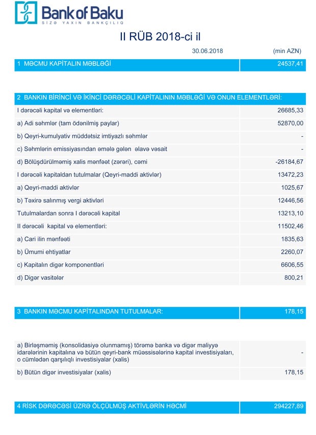 30 İyun 2018-ci il tarixində “Bank of Baku” 299 milyon 459 min manat cəmi aktivlərə (o cümlədən 186 milyon 497 min manatı müştərilərə verilmiş kreditlər), 261 milyon 712 min manat cəmi öhdəliklərə (o cümlədən 166 milyon 72 min manatı müştərilərin depozitləri) və 37 milyon 746 min manat cəmi balans kapitalına malik olub.