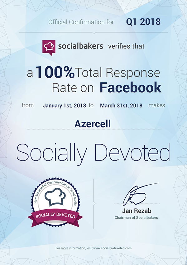 Ölkədə sosial şəbəkələr üzərindən və onlayn rejimdə ilk müştəri xidmətləri təqdim edən “Azercell Telekom” MMC yüksək xidmət səviyyəsini və peşəkarlığını bir daha sübut edib. 2018-ci ilin birinci rübündə rəsmi Facebook səhifəsində istifadəçilərin verdiyi sualların 100%-ni operativ şəkildə cavablandırdığına görə beynəlxalq “Socialbakers” şirkəti tərəfindən “Socially Devoted” sertifikatına layiq görülüb. Bu nailiyyəti daha da təqdirəlayiq edən məqam Azercell-in rəsmi Facebook səhifəsində 440 000-dən artıq izləyici sayıdır və bu rəqəm böyümə dinamikasına malikdir. Şirkət Twitter sosial şəbəkəsində də abunəçilərinin bütün suallarını cavablandıraraq, bu göstərici ilə növbəti dəfə digər mobil operatorları geridə qoyub.