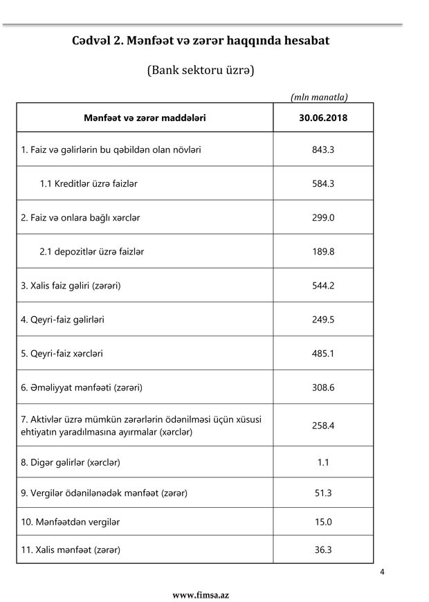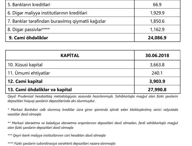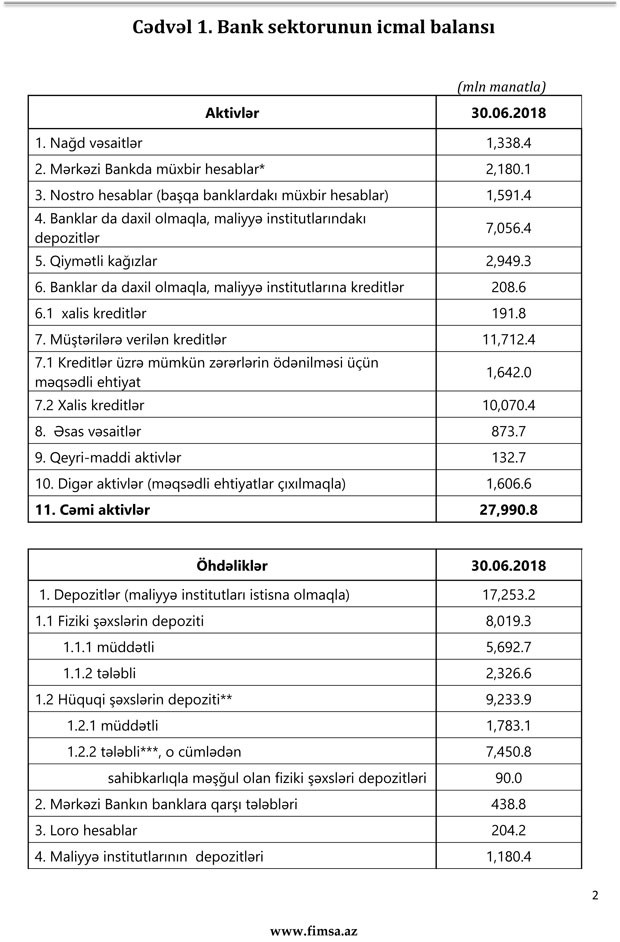30 iyun 2018-ci il tarixinə Azərbaycanda fəaliyyət göstərən bankların cəmi aktivləri 27 milyard 991 milyon manat, kredit potfeli 11 milyard 712 milyon manat, cəmi öhdəlikləri isə 24 milyard 87 milyon manat təşkil edib. Sektorun balans kapitalı 3 milyard 904 milyon manat, əhalinin əmanətləri isə 8 milyard 19 milyon manat olub. 2018-ci ilin ilk yarımilliyində bank sektorunun aktivləri 0.2% (70 milyon manat), balans kapitalı isə 5.2% (195 milyon manat) artıb.