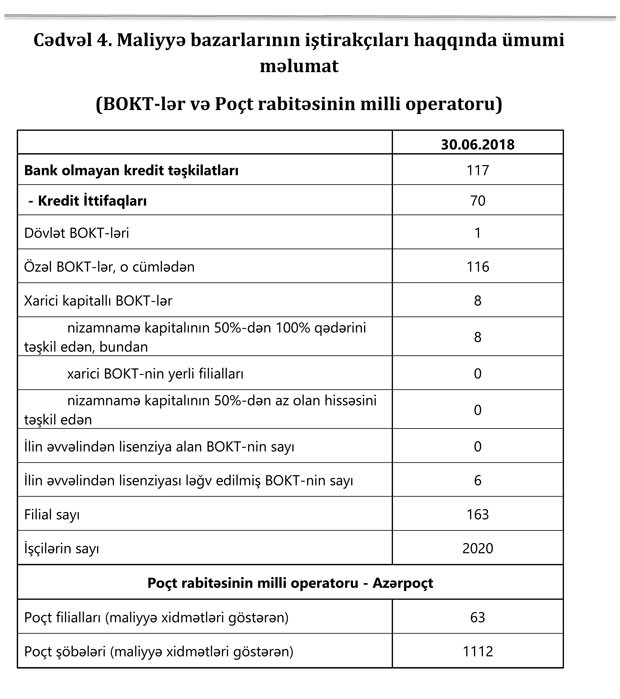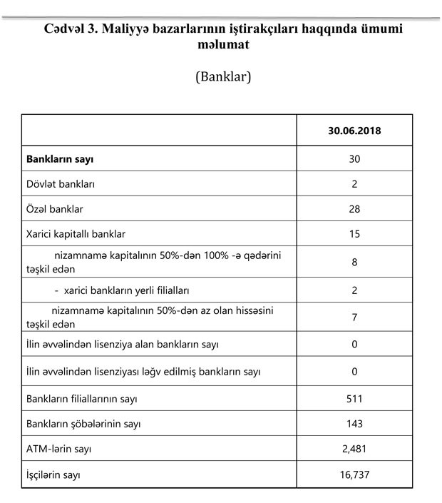 Fəaliyyət göstərən 30 bankın filiallarının sayı 511, şöbələrinin sayı 143, ATM-lərin sayı 2 481 olub. Bütövlükdə, bank sektorunun işçi heyəti cari ilin 6 ayı ərzində 3.5% və ya 566 nəfər (iyun ayı üzrə 0.5%, 75 nəfər) artaraq 16 737 nəfər təşkil edib.
