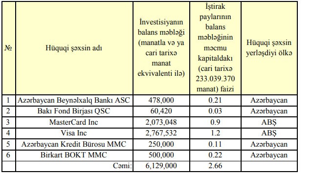 “Marja” xəbər verir ki, "Kapital Bank" “MasterCard Inc”a 2 milyon 73 min manat, “Visa Inc”a 2 milyon 767 min manat investisiya yatırıb.