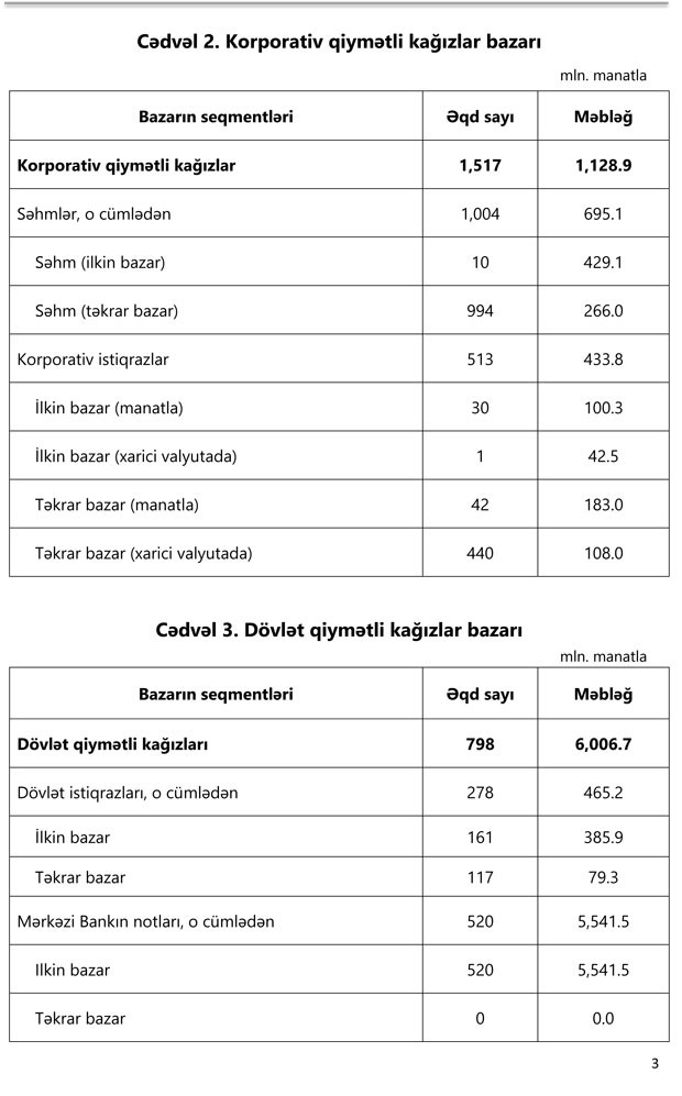Maliyyə Bazarlarına Nəzarət palatasının yaydığı məlumata görə, əməliyyatların 52.2%-i (6 milyard 499 milyon manat) ilkin bazarda, 47.8%-i (5 milyard 952 milyon manat) isə təkrar bazarda aparılıb.