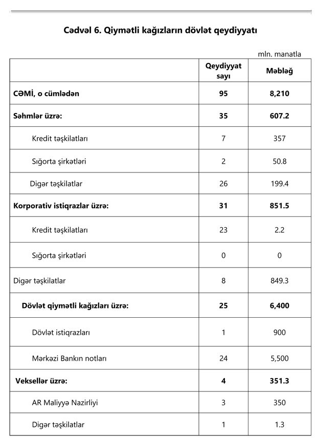 Hesabat dövründə ümumilikdə 8 milyard 210 milyon manat həcmində (95 sayda qeydiyyat) qiymətli kağızların dövlət qeydiyyatı aparılıb.