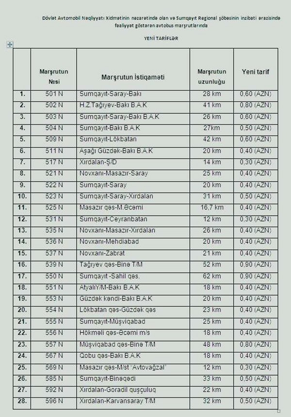 Qeyd edək ki, Tarif Şurasının 30 iyul qərarı ilə avtobus və metro nəqliyyatında sərnişindaşıma xidmətləri 50 faiz bahalaşıb. Sərnişinlərin narazılığı nəzərə alınaraq 501, 502, 503 saylı marşrut xətləri üzrə (Bakı-Sumqayıt) gediş haqqı 80 qəpikdən 60 qəpiyə endirilib.