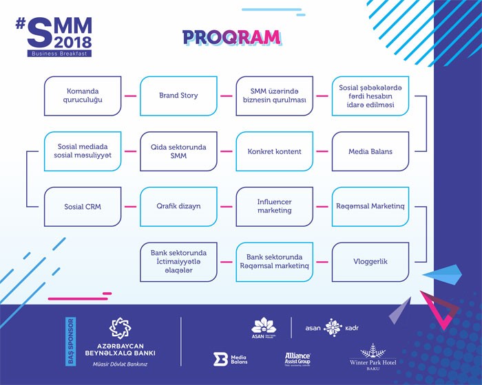 Artıq 3 ildir ki təşkil olunan #SMM Business Breakfast layihəsi çərçivəsində bu il Azərbaycan Beynəlxalq Bankının baş sponsorluğu və ASAN Könüllülük Məktəbinin "ASAN kadr" karyera mərkəzinin təşkilatçılığı ilə gənclər üçün 2 aylıq ödənişsiz SMM təlimi keçiriləcək. Burada ölkənin tanınmış SMM mütəxəssisləri 2 ay ərzində gənc iştirakçılara bu sənətin incəliklərini öyrədəcəklər.