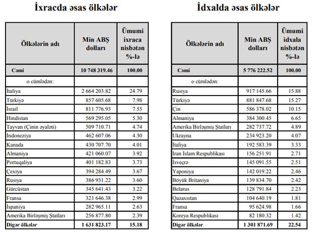 Hesabat dövründə Azərbaycanın bütün xarici ticarət dövriyyəsinin 7,89%-i Rusiya ilə ticarət əməliyyatlarının payına düşüb.