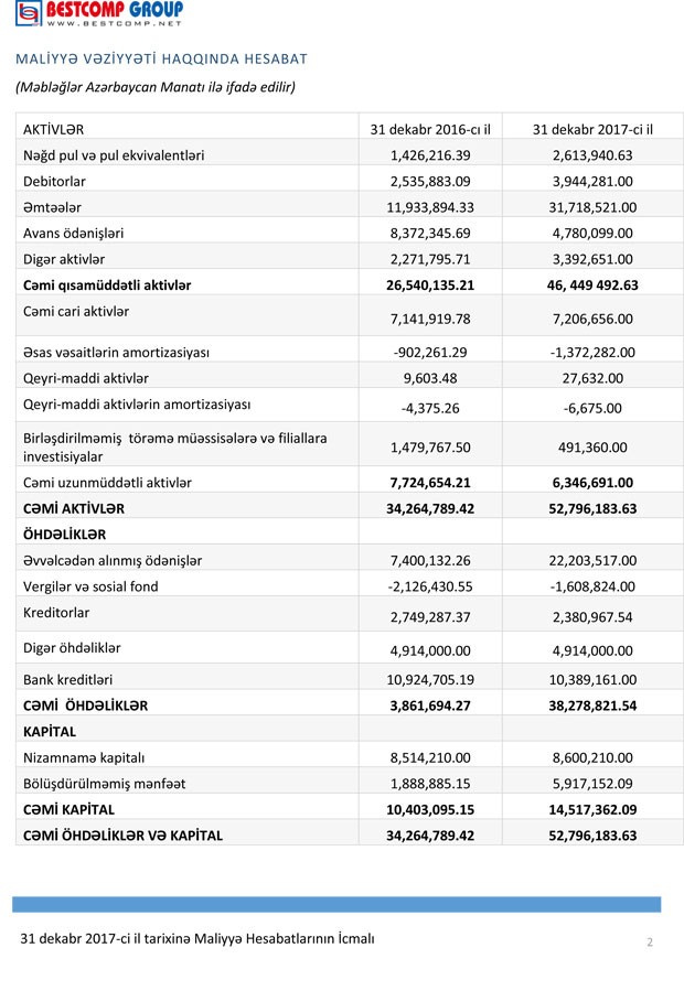 “Marja” şirkətin maliyyə hesabatına istinadən xəbər verir ki, “BestComp Group”un 2017-ci ildə əməliyyat gəliri 2016-cı illə müqayisədə 77,5% artaraq 70 milyon 143 min manata çatıb. Şirkət 2016-cı ildə 39 milyon 507 min manat əməliyyat gəliri əldə etmişdi.