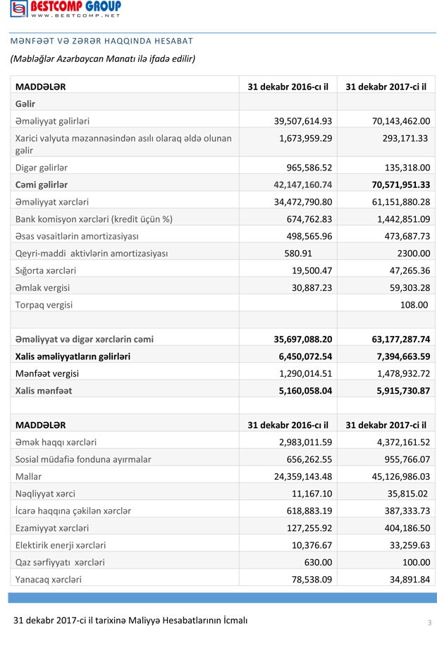 Cənubi Qafqaz və Orta Asiyanın İKT sektorunun liderlərindən biri olan “BestComp Group” şirkəti 2017-ci ili 5 milyon 916 min manat xalis mənfəət ilə başa vurub. 2016-cı illə müqayisədə şirkətin xalis mənfəəti 14,6% artıb. “BestComp Group” 2016-cı ili 5 milyon 160 min manat xalis mənfəətlə bağlamışdı.