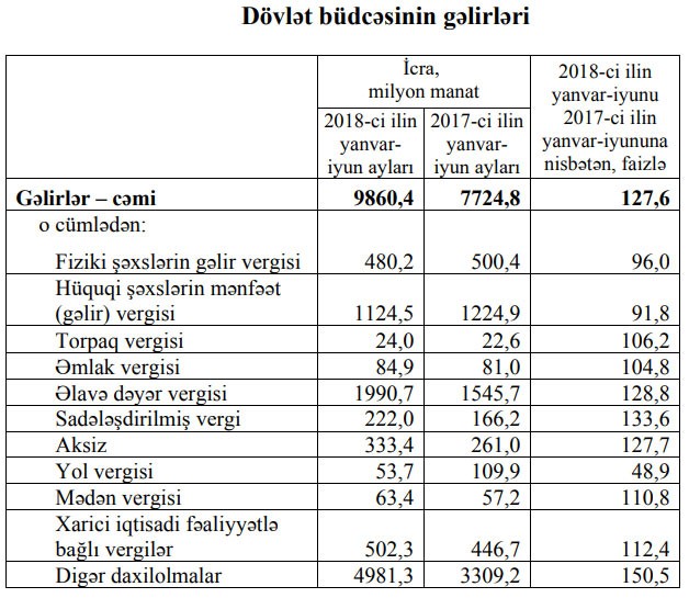 2018-ci ilin yanvar-iyun aylarında dövlət büdcəsinin gəlirləri əvvəlki ilin eyni dövru ilə müqayisədə 27,6 faiz artaraq 9 milyard 860,4 milyon manata, xərcləri isə 16,2 faiz artaraq 9524,3 milyon manata çatmışdır. Büdcənin icrasında yaranmış 336,1 milyon manatlıq profisit ümumi daxili məhsulun 0,9 faizini təşkil etmişdir.