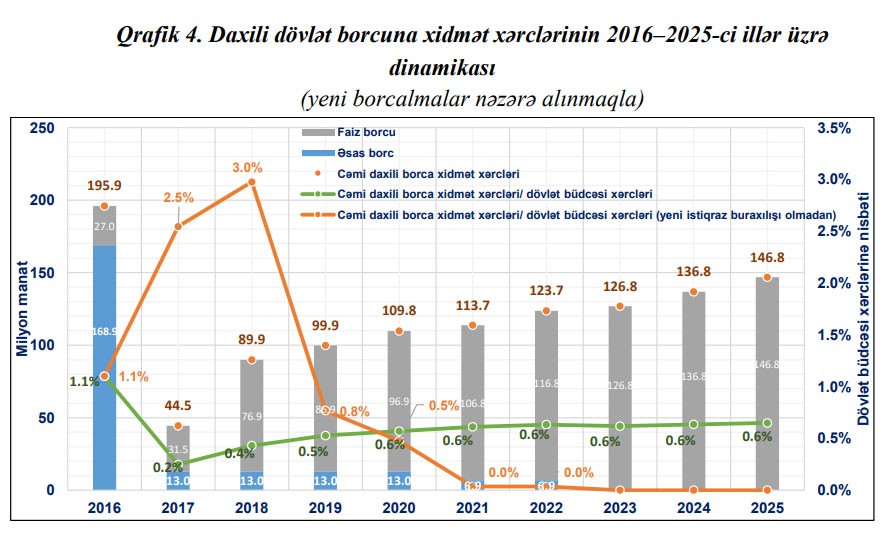 “Marja”nın məlumatına görə, Starategiyada qeyd edilir ki, daxili bazarın inkişafını təmin etmək məqsədilə daxili dövlət borcunun illər üzrə tədricən artması proqnozlaşdırılsa da, bu borcun hər il emissiya ediləcək dövlət istiqrazları hesabına yenidən maliyyələşdirilməsi nəticəsində dövlət büdcəsi üzərinə ağır yük düşməyəcəkdir.