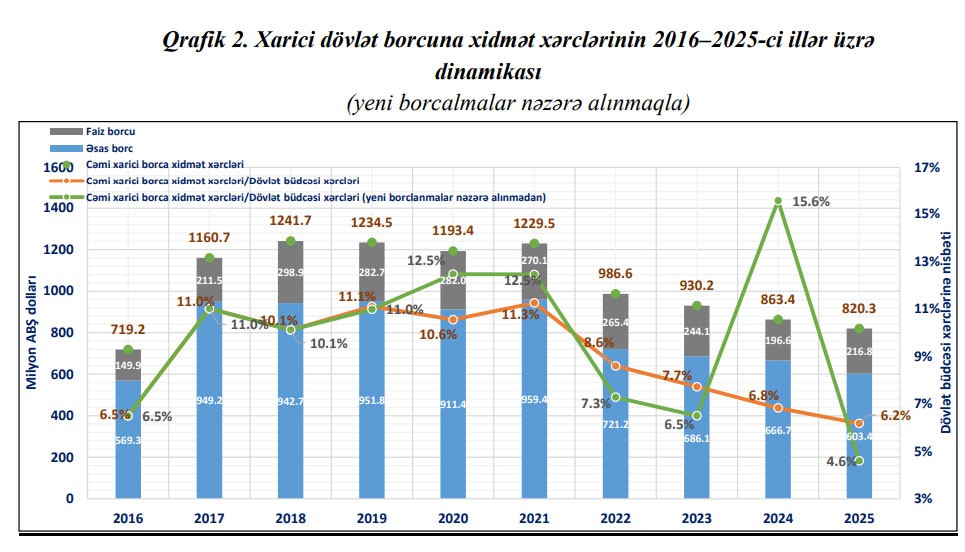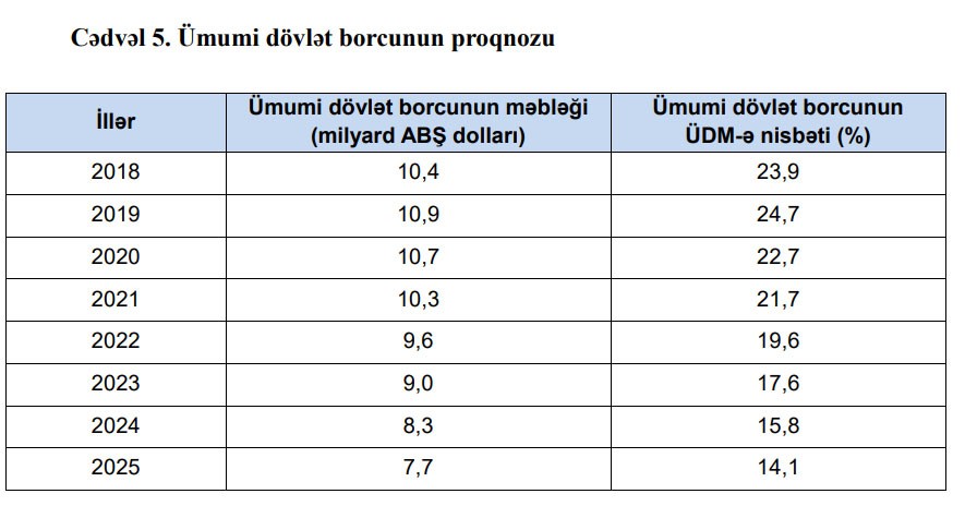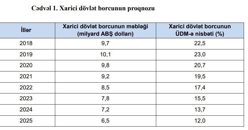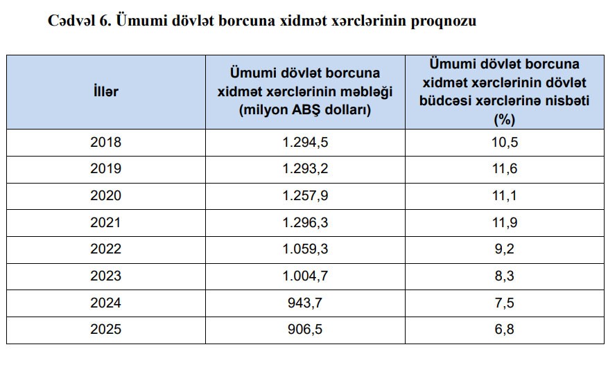 “Marja” “Azərbaycan Respublikasında dövlət borcunun idarə edilməsinə dair orta və uzun müddət üçün Strategiya”ya istinadən xəbər verir ki, bu il ümumi dövlət borcuna xidmət xərclərinin məbləğinin 1 milyard 294,5 milyon dollar təşkil edəcəyi gözlənilir. Bu xərcin 2021-ci ildək hər il azalacağı, 2021-ci ildə yenidən artaraq 1 milyard 296,3 milyard dollara qalxacağı və 2025-ci ildə isə 906,5 milyon dollara düşəcəyi proqnozlaşdırılır.