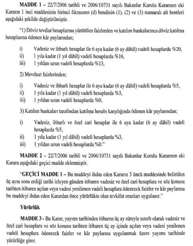 Türkiyə Prezidentinin fərmanı ilə Türk Lirəsində banklarda yerləşdirilən əmanətlər vergidən azad edilib. Fərman Türk Lirəsində əmanətin təşviq edilməsi məqsədini güdür.