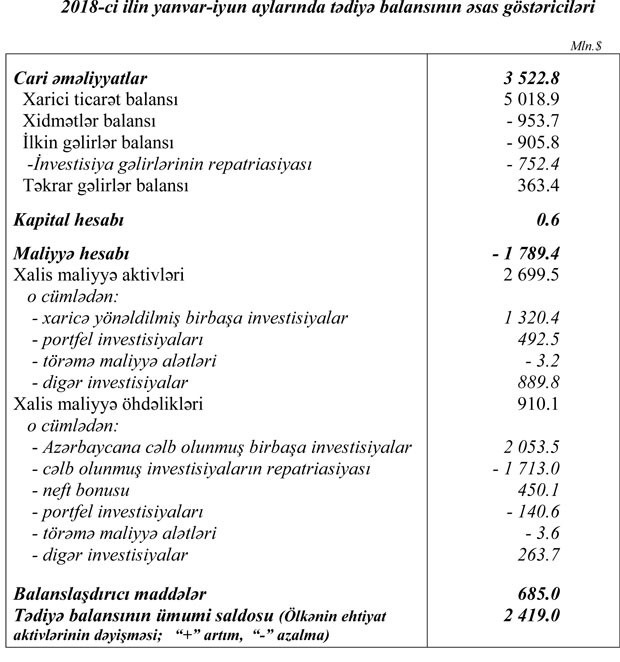 Cari əməliyyatlar hesabı 2018-ci ilin yanvar-iyun aylarında cari əməliyyatlar hesabında 3.5 milyard dollar məbləğində profisit yaranmış, o cümlədən neft-qaz sektoru üzrə profisit 6.3 milyard dollar məbləğində olmuşdur. Qeyri-neft sektoru üzrə CƏB kəsiri ötən ilin müvafiq dövrünə nisbətən 25.7% (564 milyon dollar), neft-qaz sektoru üzrə CƏB profisiti isə 2.1 dəfə (3.3 milyard dollar) artmışdır. Neftqaz sektorunun 6.3 milyard dollarlıq profisiti qeyri-neft sektoru üzrə cari hesabın 2.8 milyard dollarlıq məbləğində kəsirini tam örtmüşdür. CƏB profisitin əsas amilləri: