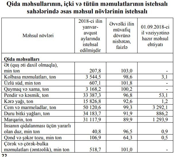 2018-ci ilin 8 ayı ərzində bir əvvəlki ilin eyni dövrü ilə müqayisədə qida məhsullarının istehsalında isə 1 faiz azalıb.