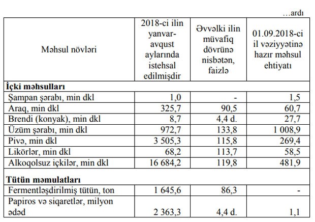 Ötən ilin yanvar-avqust ayları ilə müqayisədə bu ilin eyni aylarında tütün məmulatlarının istehsalında 2,6 dəfə, içki istehsalında 9,3 faiz artım, qida məhsullarının istehsalında isə 1 faiz azalma müşahidə olunub.