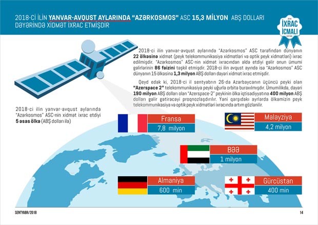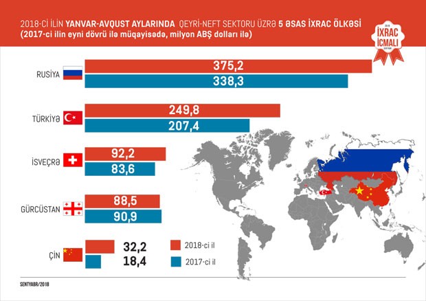 Cari ilin yanvar-avqust ayları ərzində Rusiyaya 375 milyon, Türkiyəyə 249,8 milyon, İsveçrəyə 92 milyon, Gürcüstana 88,5 milyon və Çinə 32 milyon ABŞ dolları dəyərində qeyri-neft sektoruna aid mal ixrac olunub.
