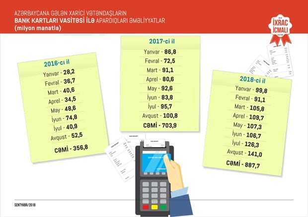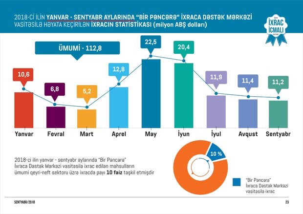 İcmalın bu sayında göstərilir ki, Dövlət Gömrük Komitəsinin məlumatına əsasən 2018-ci ilin yanvar-avqust ayları ərzində Azərbaycan Respublikasının ixracı 12,9 milyard ABŞ dolları təşkil edib. Bu müddətdə Azərbaycan Respublikasında qeyri-neft sektoru üzrə ixrac isə 1 milyard 94 milyon ABŞ dolları olub. 2017-cı ilin müvafiq dövrü ilə müqayisədə 2018-ci ilin yanvar-avqust ayları ərzində qeyri-neft sektoru üzrə ixrac 131 milyon ABŞ dolları və ya 14 faiz artıb.
