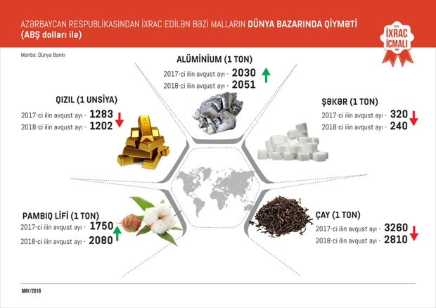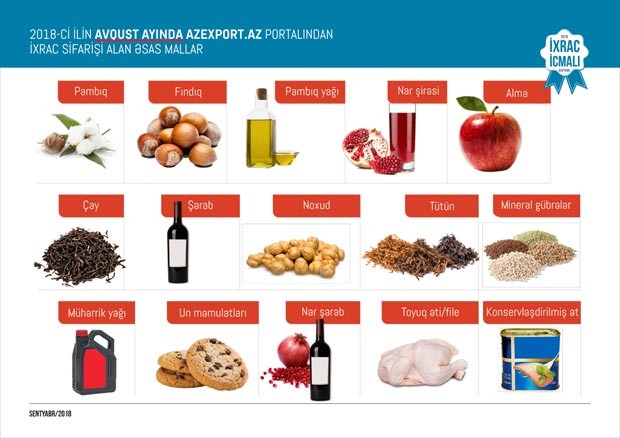 2018-ci ilin avqust ayında qeyri-neft sektoru üzrə ixracda qızıl (12,6 milyon ABŞ dolları) birinci, pambıq lifi (12,4 milyon ABŞ dolları) ikinci, emal olunmamış aşqarlanmamış alüminium (8,4 milyon ABŞ dolları) isə üçüncü olub.
