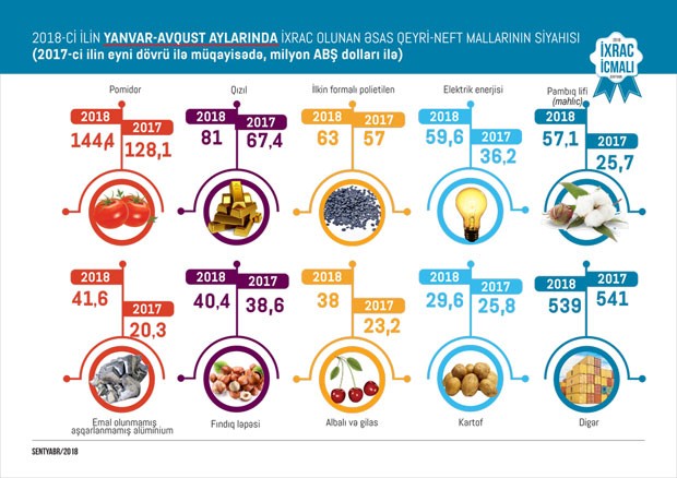 2018-ci ilin yanvar-avqust ayları ərzində ixrac edilən qeyri-neft sektoruna aid malların siyahısında pomidor 144,4 milyon ABŞ dolları ixrac dəyəri ilə liderliyini qoruyub. Bu siyahıda qızıl (81 milyon ABŞ dolları) ikinci və xüsusi kütləsi 0,94-dən az olan ilkin formalı polietilen (63 milyon ABŞ dolları) üçüncü olub.
