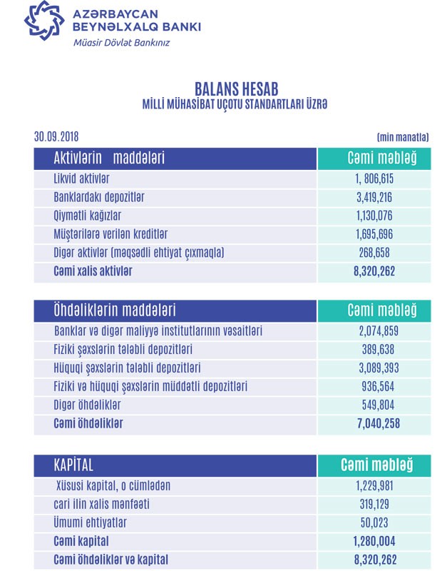 Bankdan "Marja"hya daxil olmuş məlumata görə, 30 sentyabr 2018-ci il tarixinə Azərbaycan Beynəlxalq Bankının aktivləri 8.32 milyard manat, balans kapitalı – 1.28 milyard manat təşkil edib.