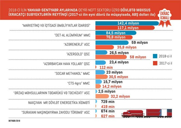 2018-ci ilin yanvar-sentyabr aylarında qeyri-neft sektoru üzrə qeyri-dövlət ixracatçı subyektlərin siyahısında “Azərbaycan İnterneyşnl Mayninq Kompani Limited Şirkəti”nin Azərbaycan Respublikasındakı nümayəndəliyi, "Kapitan Fruits" MMC, "MKT İstehsalat Kommersiya" MMC, "Baku Steel Company" MMC, "Qala meyvə-tərəvəz ixracat idxalat" MMC, “Azfruittrade” MMC, “Food Export Şəmkir” MMC, "Azərbaycan Şəkər İstehsalat Birliyi" MMC və “Sun Food” MMC önə çıxıb.