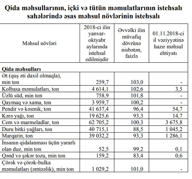Dövlət Statistika Komitəsinin aylıq hesabatında bildirilir ki, bu sahələrin əsas məhsullarından brendi (konyak) istehsalı 4 dəfə, üzüm şərabının istehsalı 39,8 faiz, alkoqolsuz içkilərin istehsalı 22,5 faiz, kolbasa məmulatlarının istehsalı 2,6 faiz, cem və marmeladların istehsalı 0,3 faiz artmış, bununla yanaşı duru bitki yağlarının istehsalı 11,5 faiz, qənd və şəkər tozu istehsalı 16,6 faiz azalmışdır.