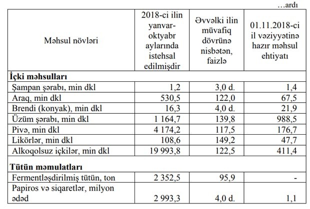 2017-ci ilin yanvar-oktyabr ayları ilə müqayisədə cari ilin 10 ayı ərzində tütün məmulatlarının istehsalında 2,5 dəfə, içki istehsalında 10,6 faiz artım müşahidə olunmuşdur.