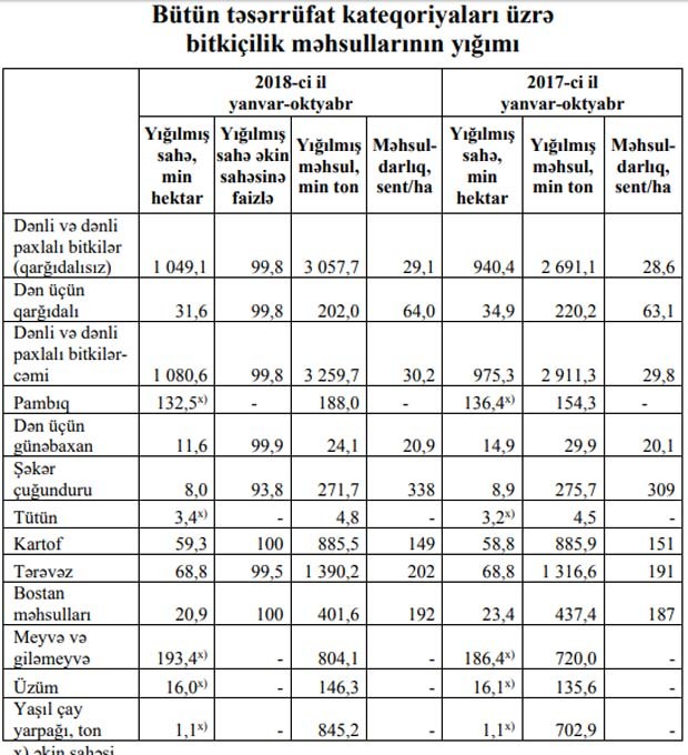Ölkədə kənd təsərrüfatı məhsullarının yığımı başa çatmaq üzrədir və noyabr ayının 1-nə kimi payızlıq və yazlıq dənli və dənli paxlalı bitkilərin (qarğıdalısız) əkin sahəsinin 99,8 faizi, yaxud 1049,1 min hektarı biçilmiş və həmin sahələrdən 3 milyon 57,7 min ton və ya ötən ilin eyni dövrü ilə müqayisədə 13,6 faiz çox məhsul götürülmüşdür. Orta hesabla hər hektardan əldə edilmiş məhsul 29,1 sentner təşkil etmişdir.