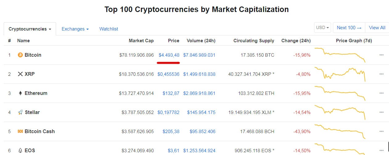 Bitcoinin qiyməti 4 500 dollardan da aşağı düşüb