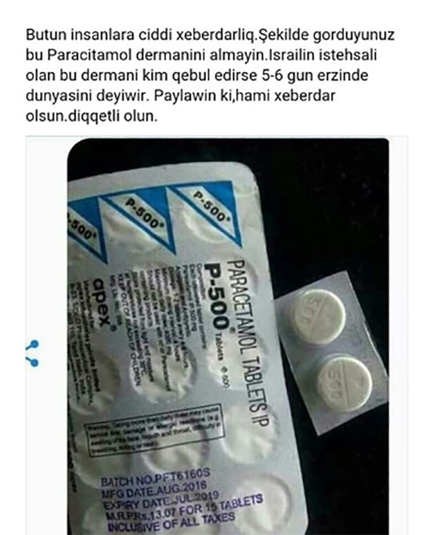 Nazirliyin mətbuat xidmətindən verilən məlumata görə, yayılan şəkildə bu dərmanın insan orqanizmi üçün zərərli olduğu, hətta ölümə səbəb ola biləcəyi göstərilib.