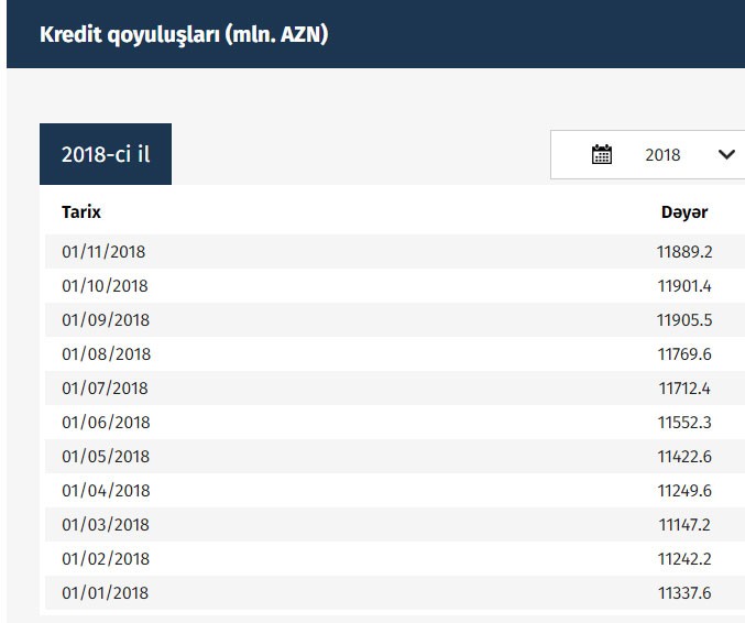 "Marja" Mərkəzi Banka istinadən xəbər verir ki, Oktyabr ayının sonunda bank sektorunun kredit qoyuluşlarının məbləği 11 milyard 889.2 milyon manata düşüb.