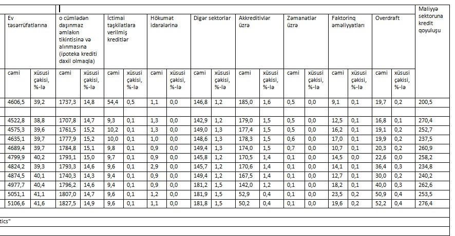 -Nəqliyyat və rabitə yə verilən kreditlər 162 milyon manat artaraq 1 milyard 288 milyon manata qalxıb;