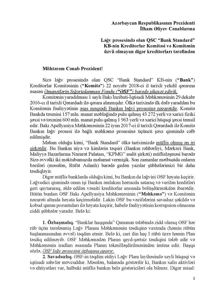 Ləğv prosesində olan "Bank Standard"ın Kreditorlar Komitəsinin qərarı ilə əmanətçilər ləğvedici olan Əmanətlərin Sığortalanması Fondundan prezident İlham Əliyevə şikayət ediblər. Bu barədə komitənin sədri Əkrəm Həsənov bildirib. Onun sözlərinə görə, dövlət başçısına kollektiv şikayət 7 məsələ barədədir: