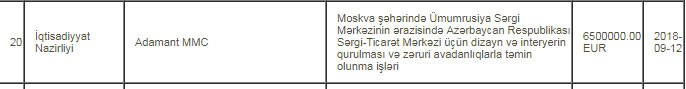 İqtisadiyyat Nazirliyi Ümumrusiya sərgi mərkəzinin ərazisində Azərbaycanın sərgi-ticarət mərkəzinin dizaynı, interyeri, zəruri avadanlıqla təmin olunmasına 6,5 milyon manat yönəldəcək.