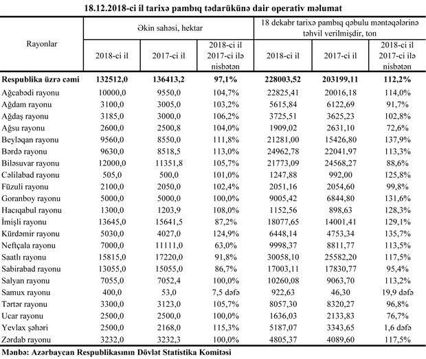 Dövlət Statistika Komitəsindən bildiriblər ki, dekabrın 18-dək ölkə üzrə pambıq qəbulu məntəqələrinə 228003 ton məhsul təhvil verilib. Bu, keçən ilin eyni dövrü ilə müqayisədə 12,2 faiz çoxdur.
