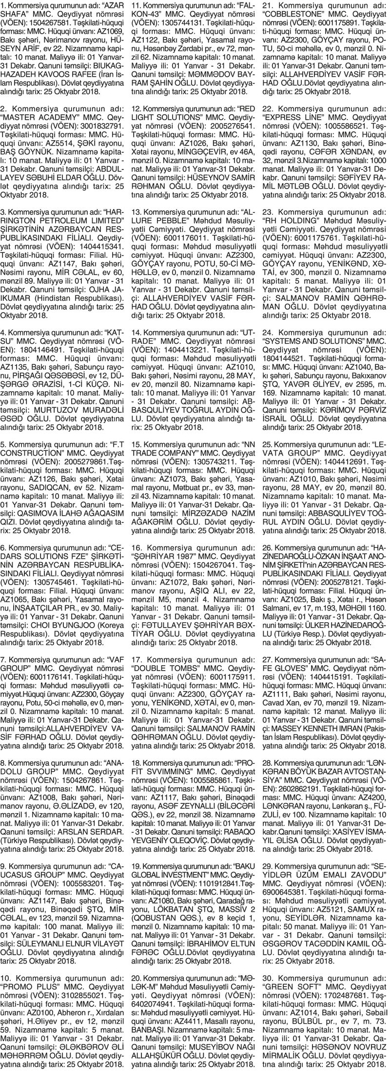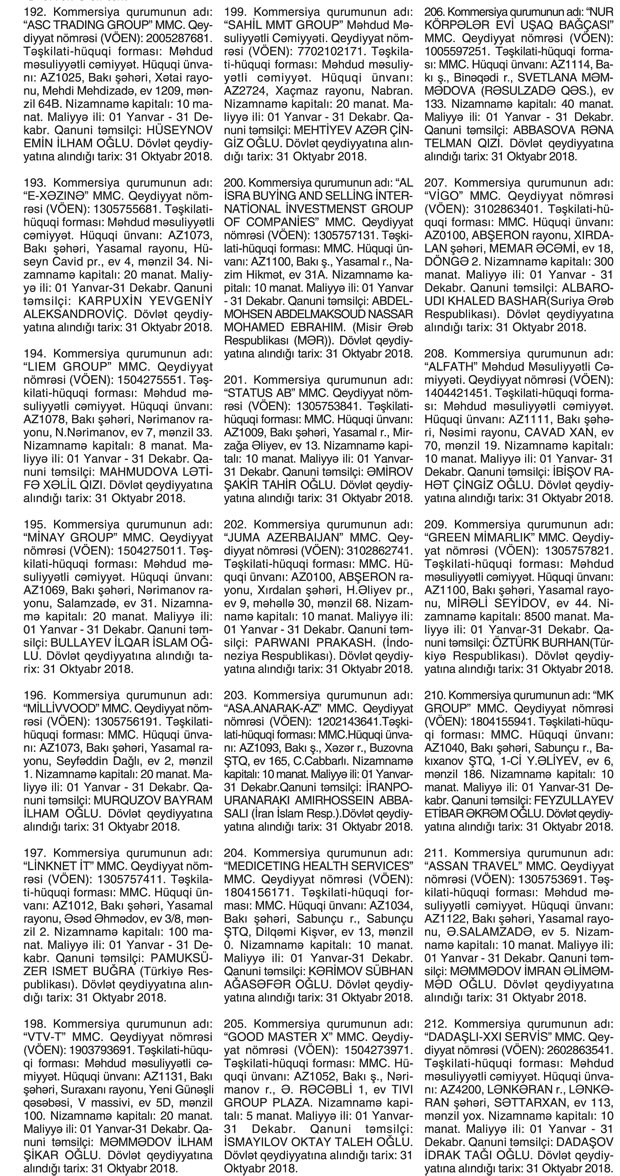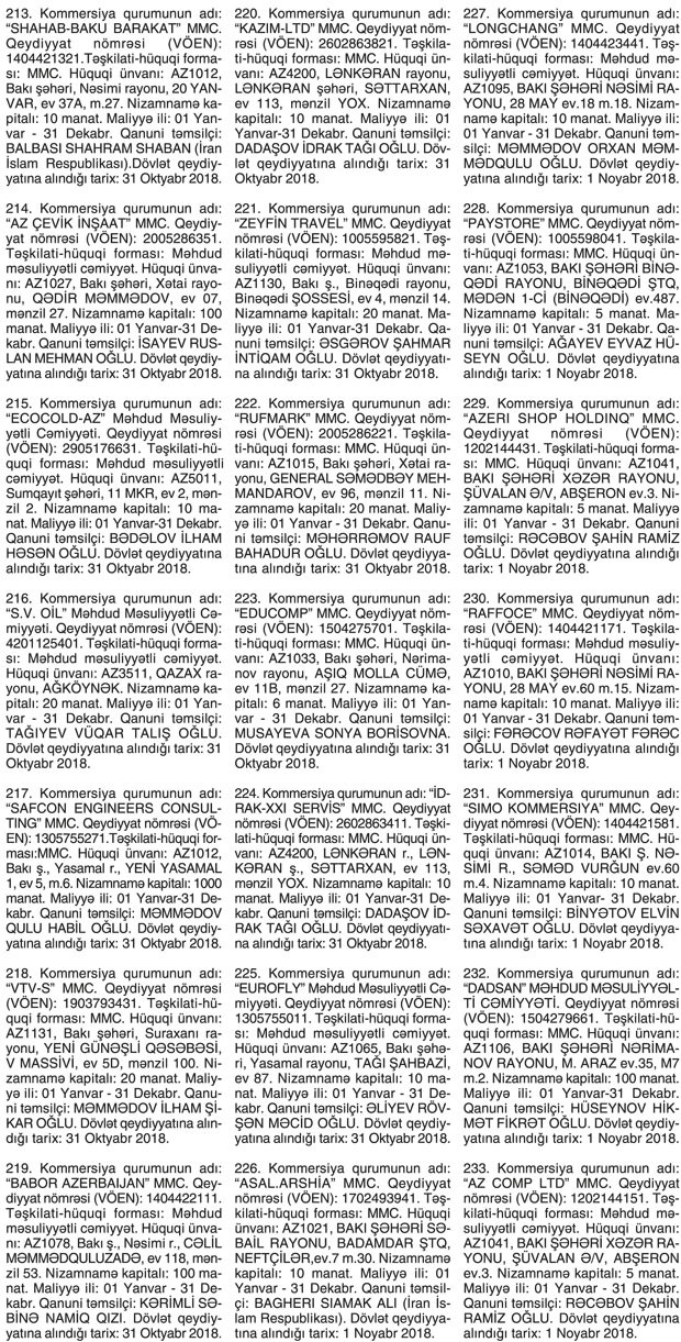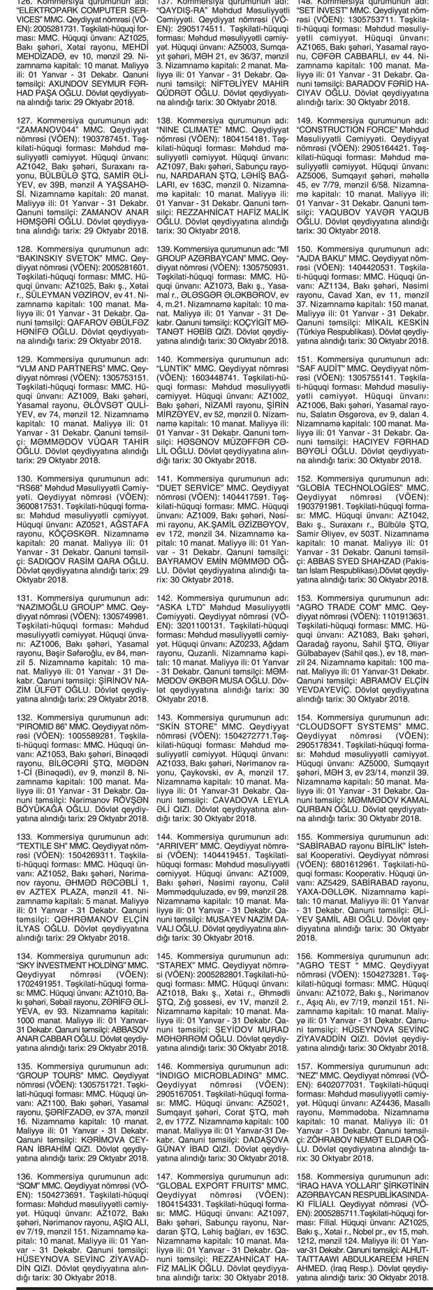 Kommersiya qurumlarının dövlət reyestri məlumatlarına əsasən yeni dövlət qeydiyyatına alınmış şirkətlər.
