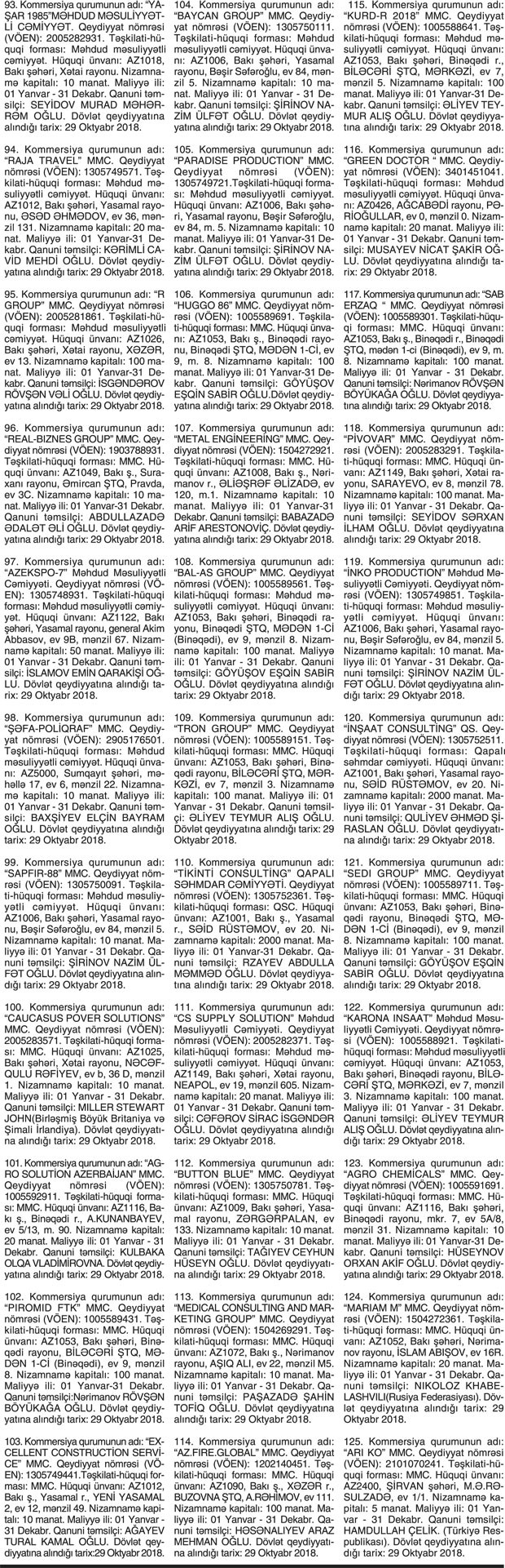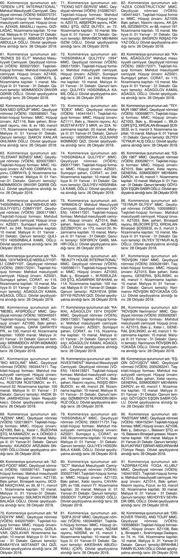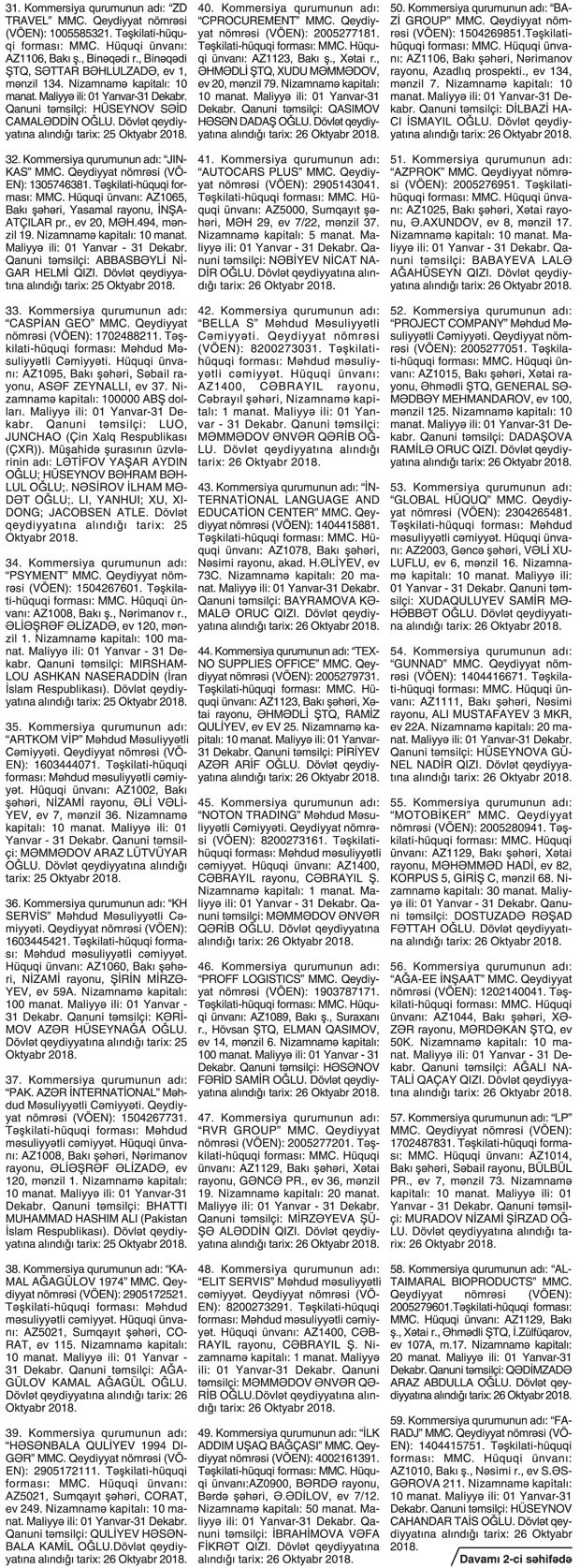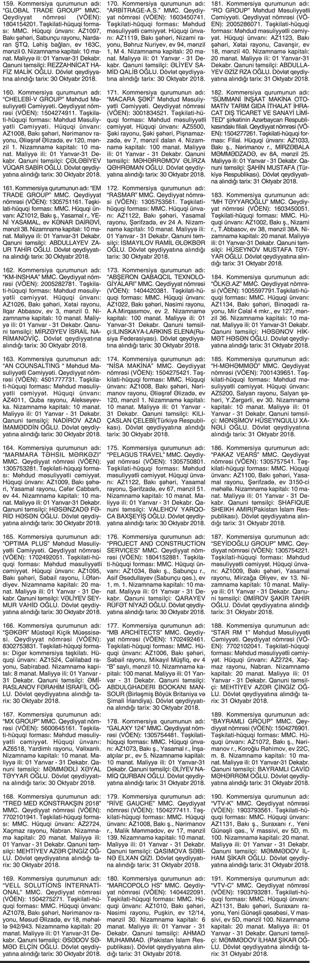 Kommersiya qurumlarının dövlət reyestri məlumatlarına əsasən yeni dövlət qeydiyyatına alınmış şirkətlər.