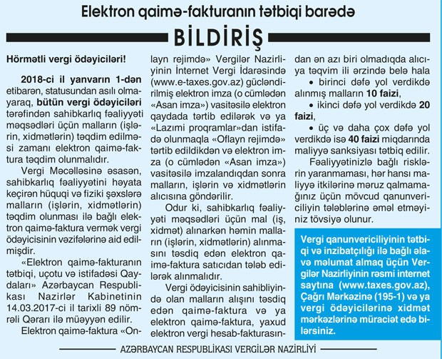 2017-ci il aprelin 1-dən əlavə dəyər vergisinin, eləcə də 6 faiz və 8 faiz dərəcə ilə sadələşdirilmiş verginin ödəyiciləri, 2018-ci il yanvarın 1-dən isə bütün vergi ödəyiciləri təqdim etdikləri mallara (işlərə, xidmətlərə) görə alıcılara elektron qaydada qaimə-faktura təqdim edirlər.