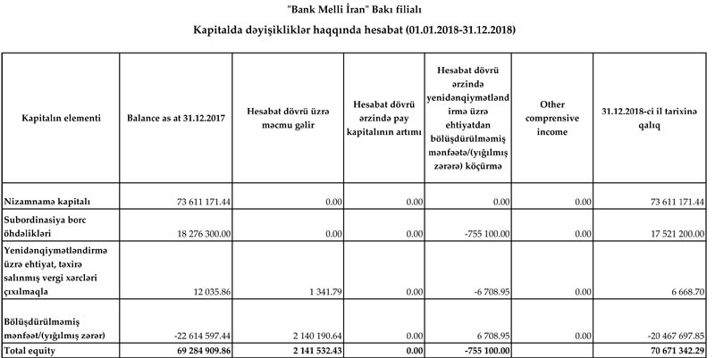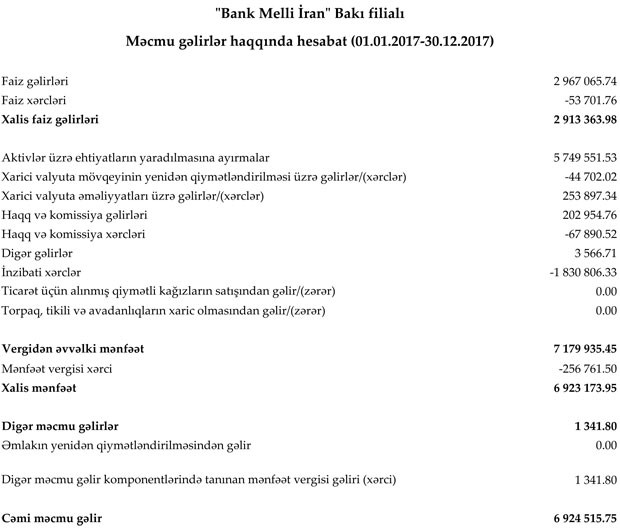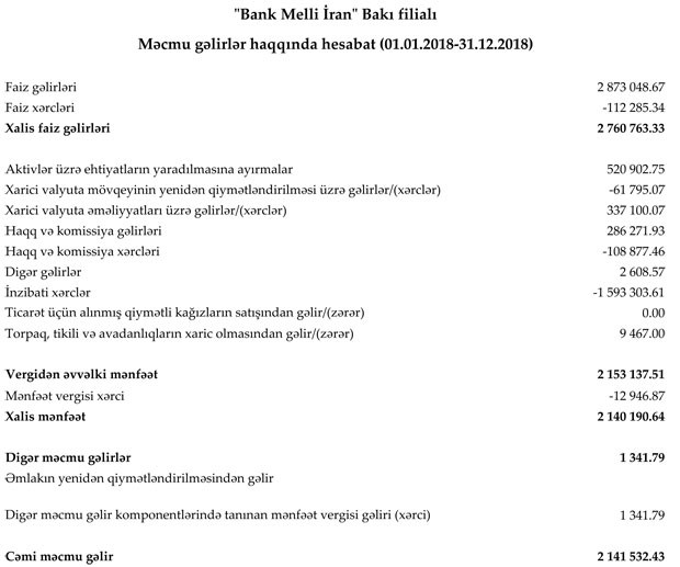 "Bank Melli İran" Bakı filialı 2018-ci ili 2  milyon 141 min 532 manat xalis mənfəət ilə başa vurub. Halbuki filial 2017-ci ili 6 milyon 924 min 515 manat xalis mənfəət ilə bağlamışdı. Beləliklə, bankın xalis mənfəəti 3,2 dəfə azalıb.