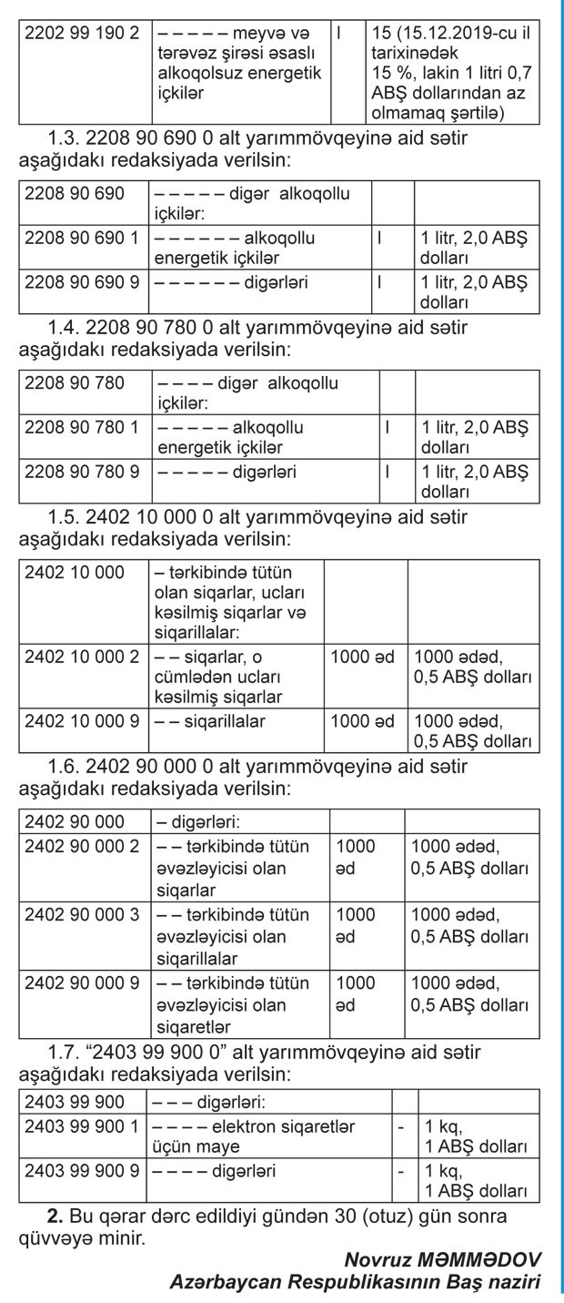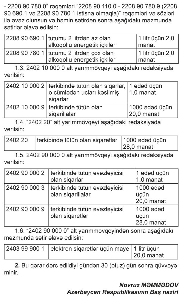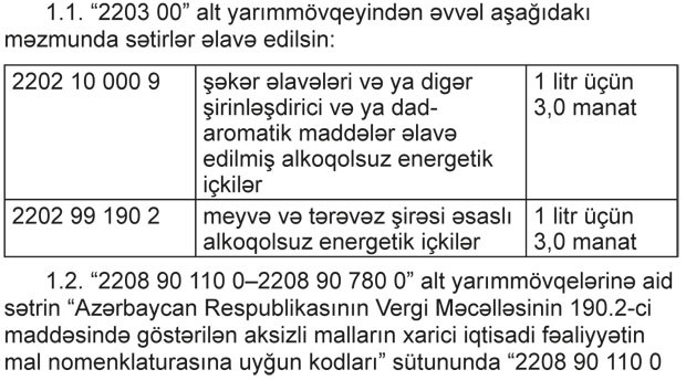 Qərarla şəkər əlavələri və ya digər şirinləşdirici və ya dadaromatik maddələr əlavə edilmiş alkoqolsuz energetik içkilər 1 litr üçün 3,0 manat, 2 meyvə və tərəvəz şirəsi əsaslı alkoqolsuz energetik içkilər 1 litr üçün 3,0 manat, tutumu 2 litrdən az olan alkoqollu energetik içkilər 1 litr üçün 2,0 manat, tutumu 2 litrdən çox olan alkoqollu energetik içkilər 1 litr üçün 2,0 manat, tərkibində tütün olan siqarlar, o cümlədən ucları kəsilmiş siqarlar 1 ədəd üçün 1,0 manat, tərkibində tütün olan siqarillalar 1000 ədəd üçün 20,0 manat, tərkibində tütün olan siqaretlər 1000 ədəd üçün 28,0 manat tərkibində tütün əvəzləyicisi olan siqarlar 1 ədəd üçün 1,0 manat, tərkibində tütün əvəzləyicisi olan siqarillalar 1000 ədəd üçün 20,0 manat, tərkibində tütün əvəzləyicisi olan siqaretlər 1000 ədəd üçün 28,0 manat, elektron siqaretlər üçün maye 1 litr üçün 20,0 manat müəyyən edilib.